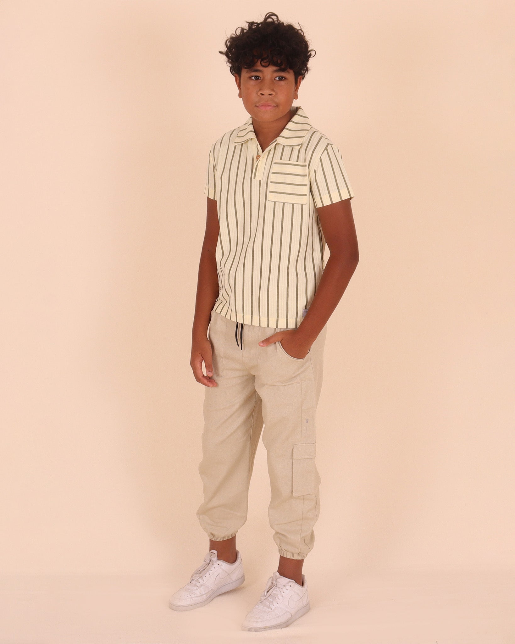 Our Side Cargo Pocket Pant for Youth Boy features side pockets with draw string detailing. Crafted from cotton twill, the composition provides comfort and durability. Finished neck and sleeve detail. Designed in Australia.