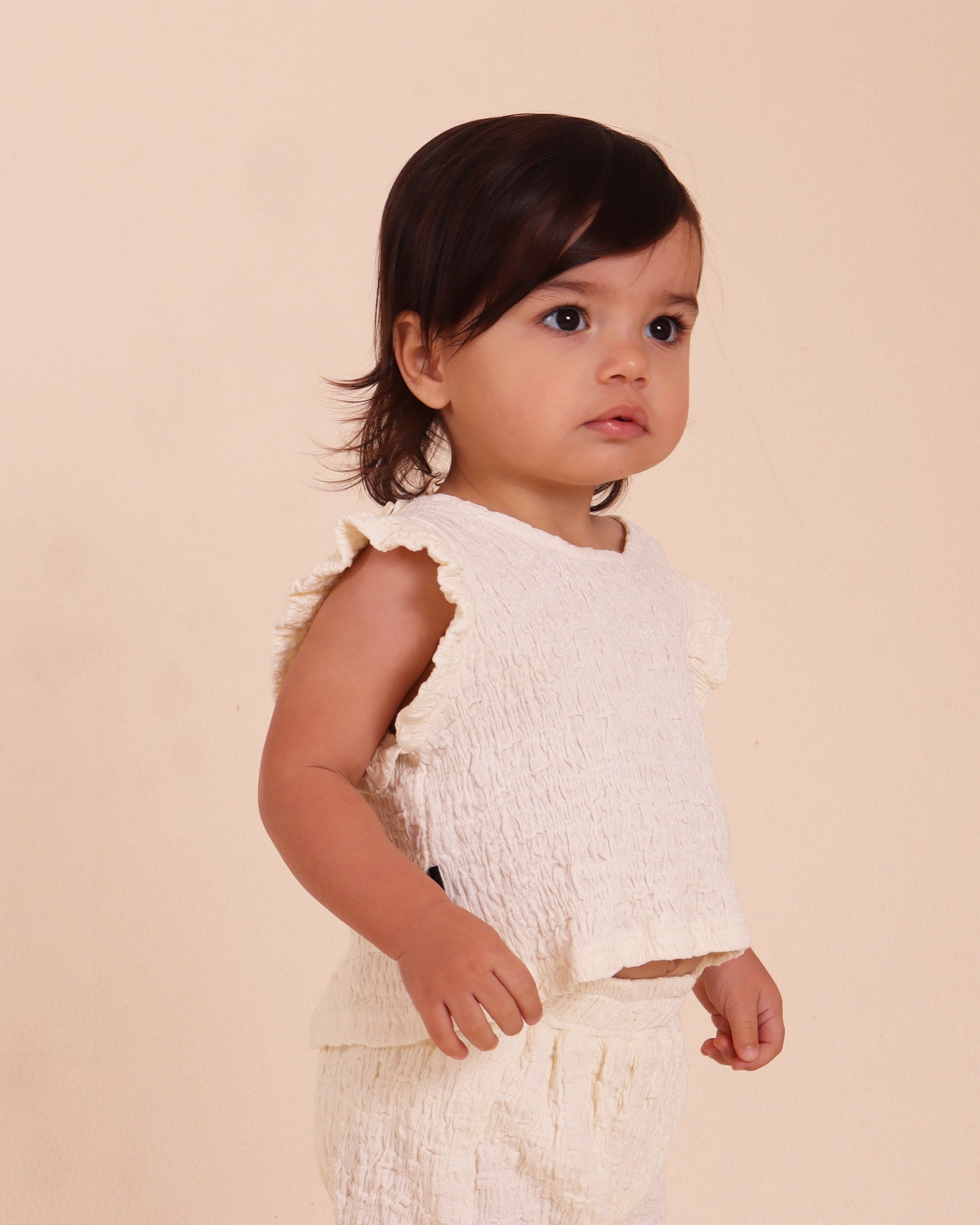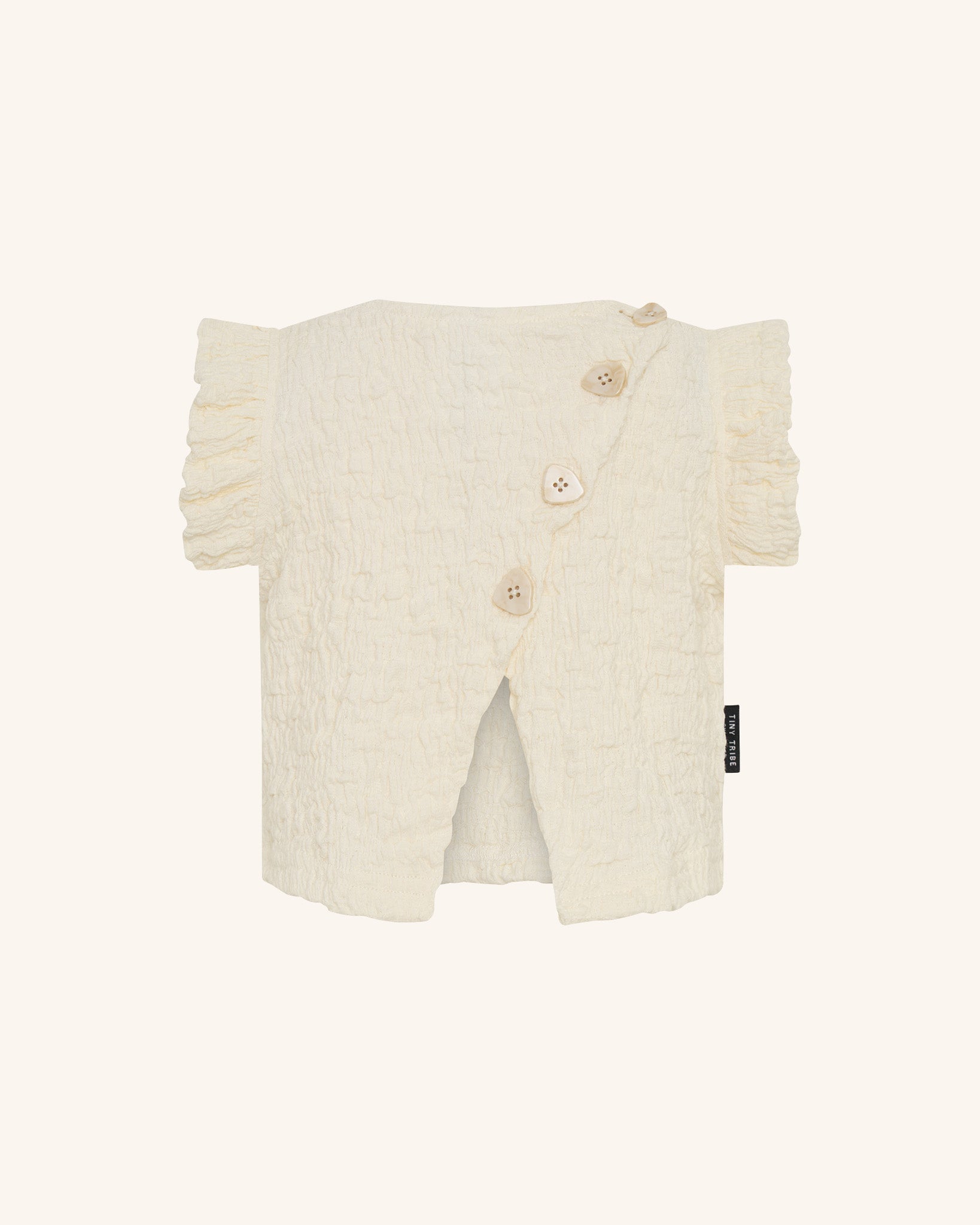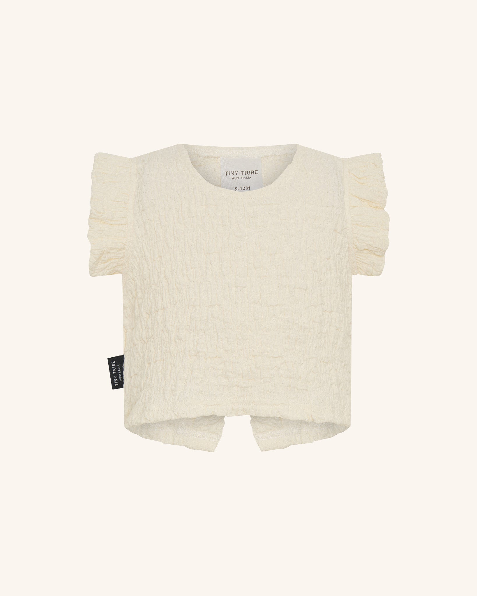 Notre top en coton froncé à volants et dos croisé est orné de boutons au dos . Confectionné en coton froncé texturé et en nylon, il offre confort, élasticité et résistance. Finitions soignées au col, aux manches et à l'ourlet. Création australienne.