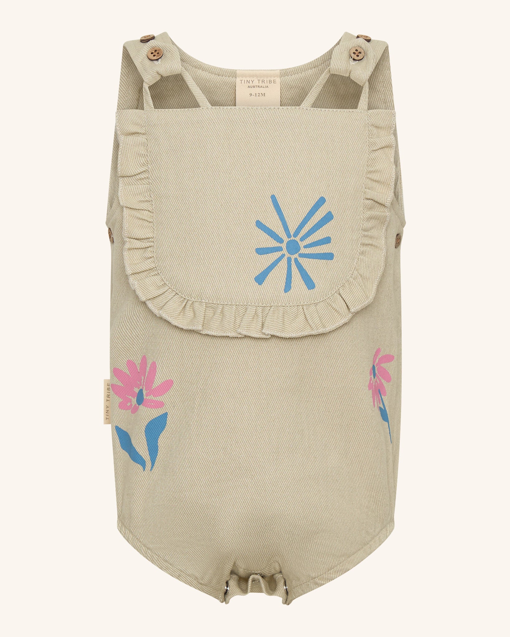 Notre salopette Flower Dungaree décontractée couleur avoine naturelle est dotée de bretelles réglables et d'une fermeture à bouton-pression en bas pour un enfilage facile. Confectionnée en sergé de coton 100 % naturel, elle offre confort et durabilité. Modèle conçu en Australie.